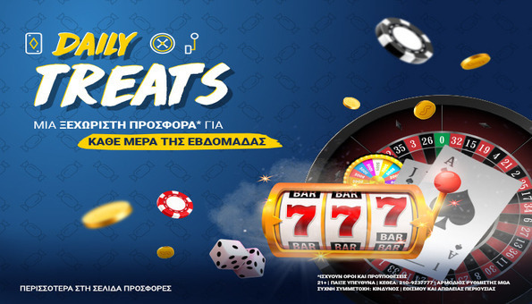 Τα μέλη του Live Καζίνο του stoiximan.gr μαθαίνουν αναλυτικές πληροφορίες  για τα Daily Treats* αφού συνδεθούν στο λογαριασμό τους. Οι εκπλήξεις «σκάνε» σε οποιαδήποτε συσκευή (υπολογιστής, mobile, tablet) και στο stoiximan app.
