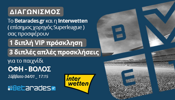 Το Betarades.gr, σε συνεργασία με τον επίσημο χορηγό της Σούπερ Λιγκ, την Interwetten**, διοργανώνουν μεγάλο διαγωνισμό για το παιχνίδι ΟΦΗ – Βόλος ΝΠΣ, το Σάββατο  04/01 στις 17:15, στο πλαίσιο της 17ης αγωνιστικής του πρωταθλήματος. Τέσσερις τυχεροί θα κερδίσουν 1 διπλή VIP πρόσκληση και 3 διπλές απλές προσκλήσεις και θα παρακολουθήσουν την αναμέτρηση από κοντά.